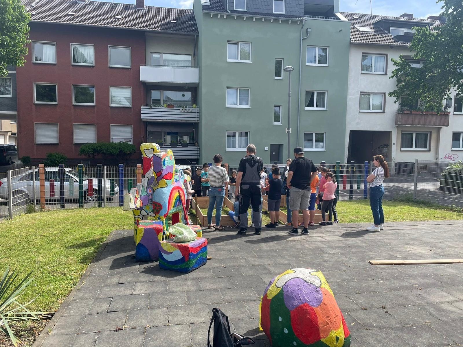 Die Klasse 2a hat mit tatkräftiger Unterstützung des Hausmeisters Herr Skrzypczyk und Eltern der Kinder vier Hochbeete gebaut und bepflanzt. In Zukunft entsteht hier ein kleiner Schulgarten, der von allen Klassen gepflegt werden kann. Die vierten Klassen haben Insektenhotels gebaut und diese anschließend kunterbunt bemalt. Außerdem haben die ersten Klassen einen Insektenspaziergang durchs Westend gemacht und dabei zwar keine Schmetterlinge, aber immerhin Raupen entdecken können.